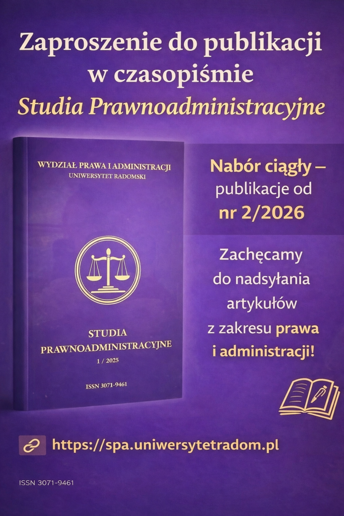 Zapraszamy autorów zainteresowanych publikacją artykułów naukowych z zakresu prawa i administracji do nadsyłania tekstów do czasopisma „Studia Prawnoadministracyjne”.