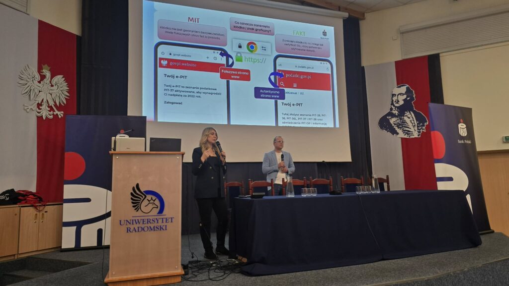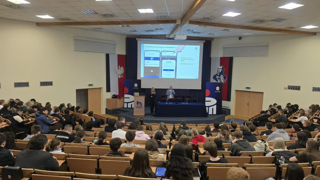 Podczas spotkania uczestnicy mieli okazję dowiedzieć się, jak w praktyce działają cyberprzestępcy oraz dlaczego to właśnie człowiek stanowi najsłabsze ogniwo systemów bezpieczeństwa. Szczególną uwagę poświęcono socjotechnice – manipulacji psychologicznej wykorzystywanej do wyłudzania danych i budowania fałszywego zaufania. Eksperci przedstawili realne przykłady zagrożeń, takich jak phishing czy podszywanie się pod instytucje finansowe, a także wskazali, jak skutecznie chronić swoje dane i reagować na podejrzane sytuacje.